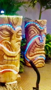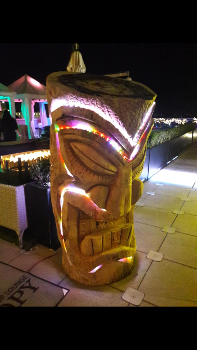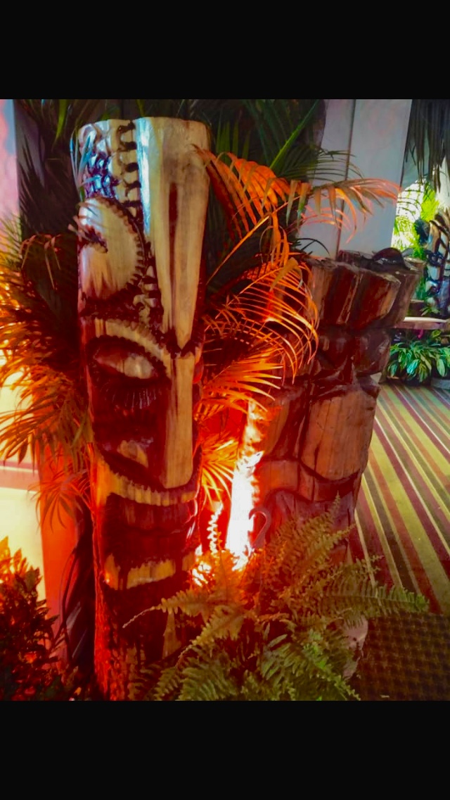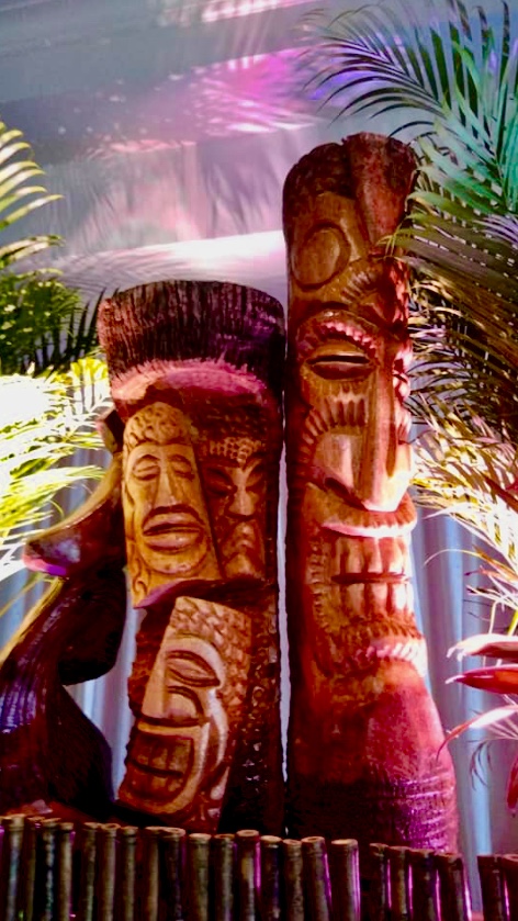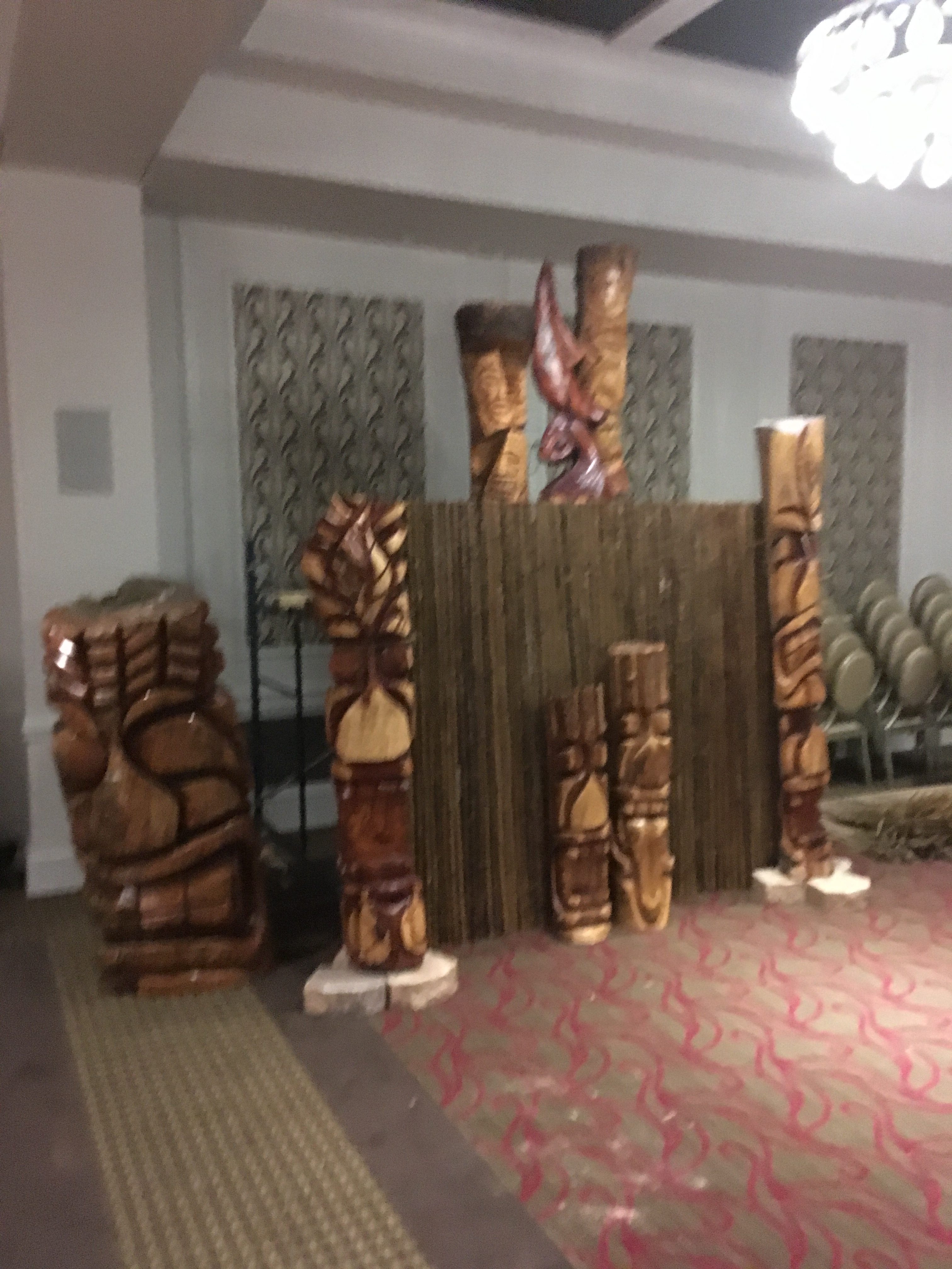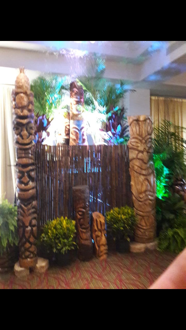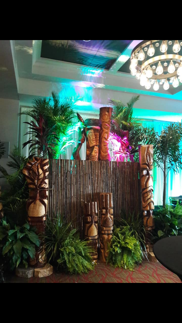 Six floral Tables glass tops 40, Pinapple glasses, as many exotic wood tables as needed, 2 sail boards painted with oceanic Art, up to 40 Tiki’s varying heights 3 feet in to 4 feet also 6 to 10 very large Tiki‘s, multiple Tiki Bars utilizing Tikis‘s as bases and exotic wood tops with bamboo facials, and pre-built Tiki huts which provide shade coverage different sizes available, as well as Thatch they could be mounted on existing structures for The Polynesian look, string lighting and battery lighting for areas without electricity and Tiki torches.