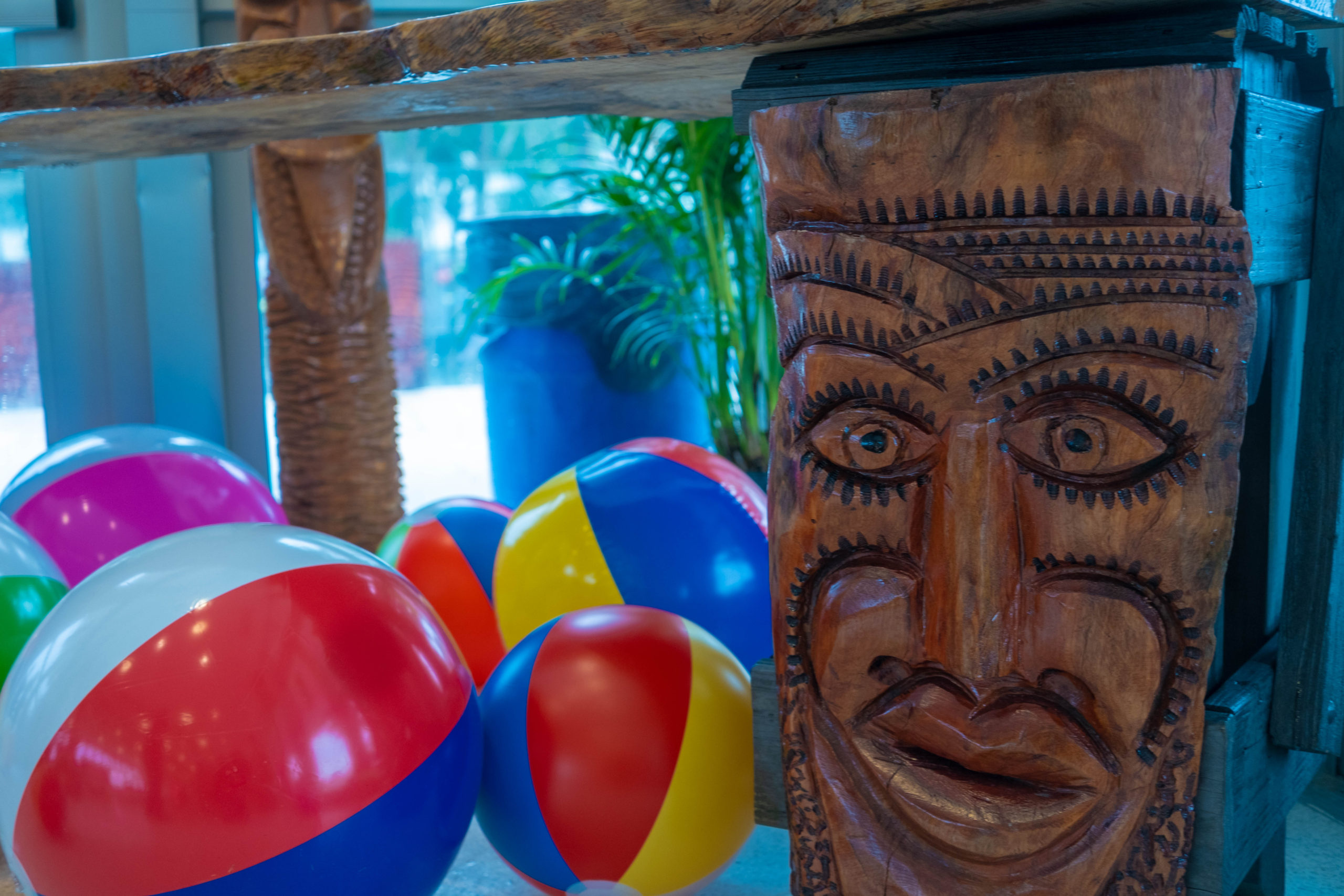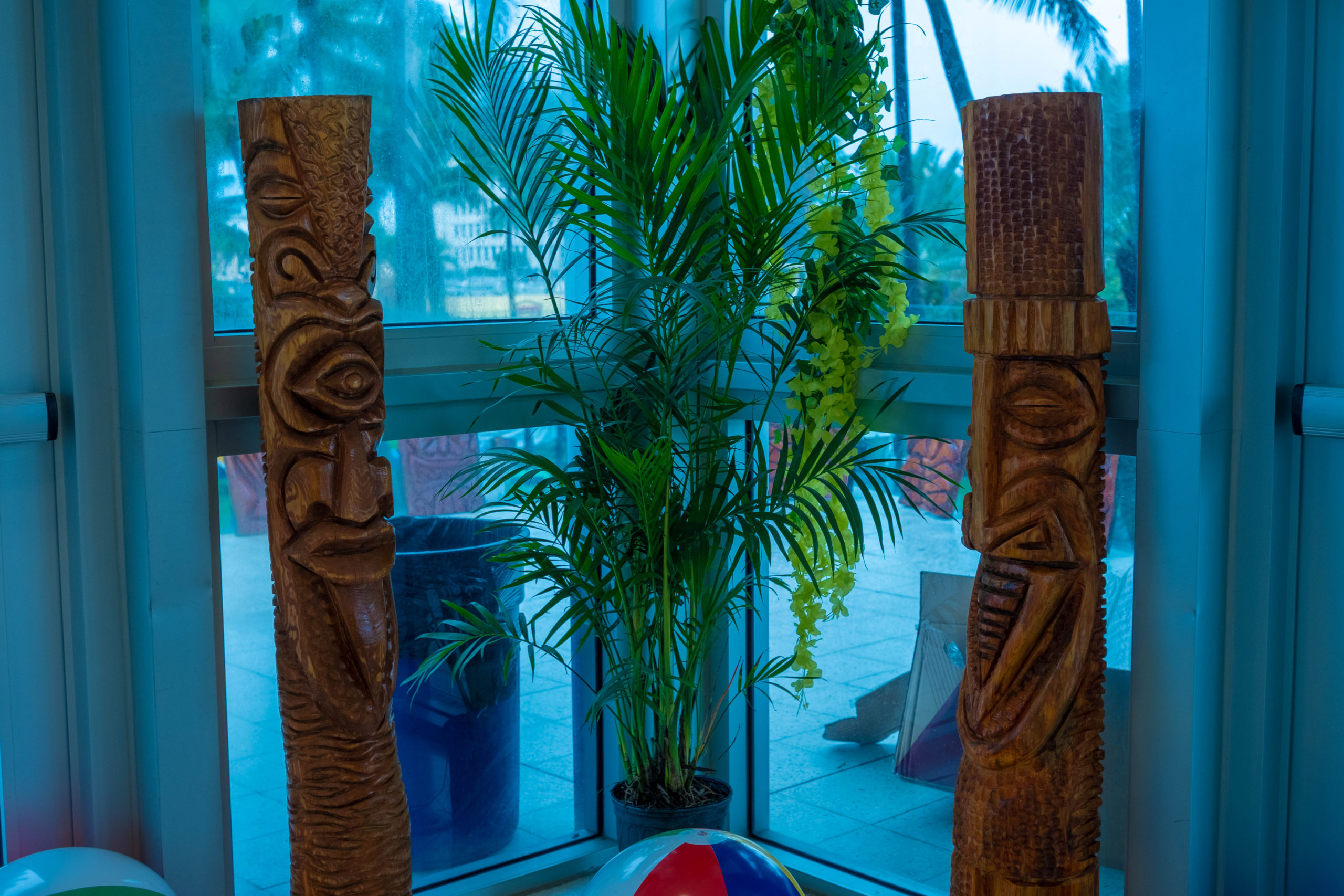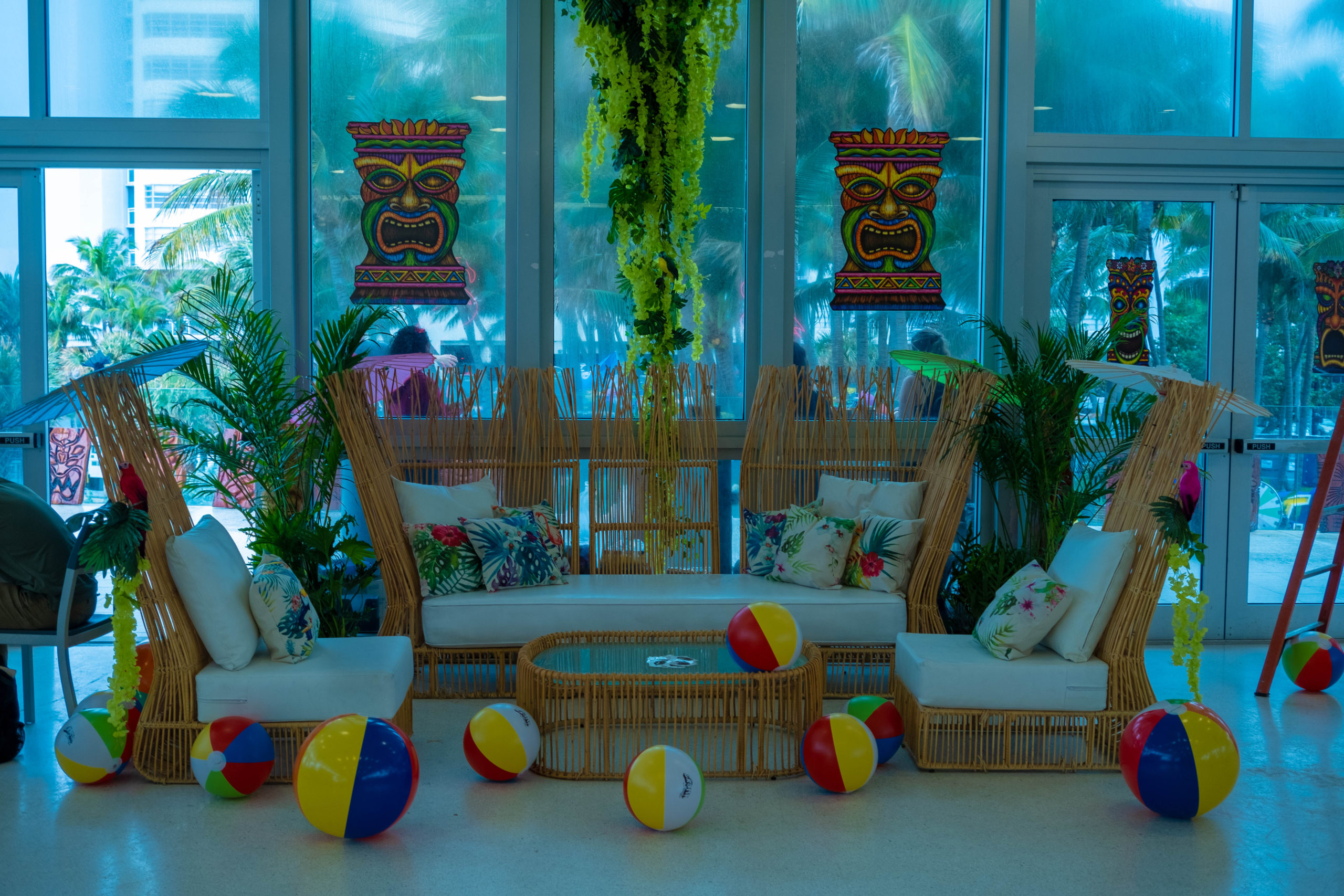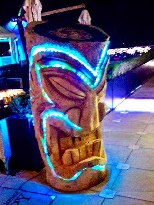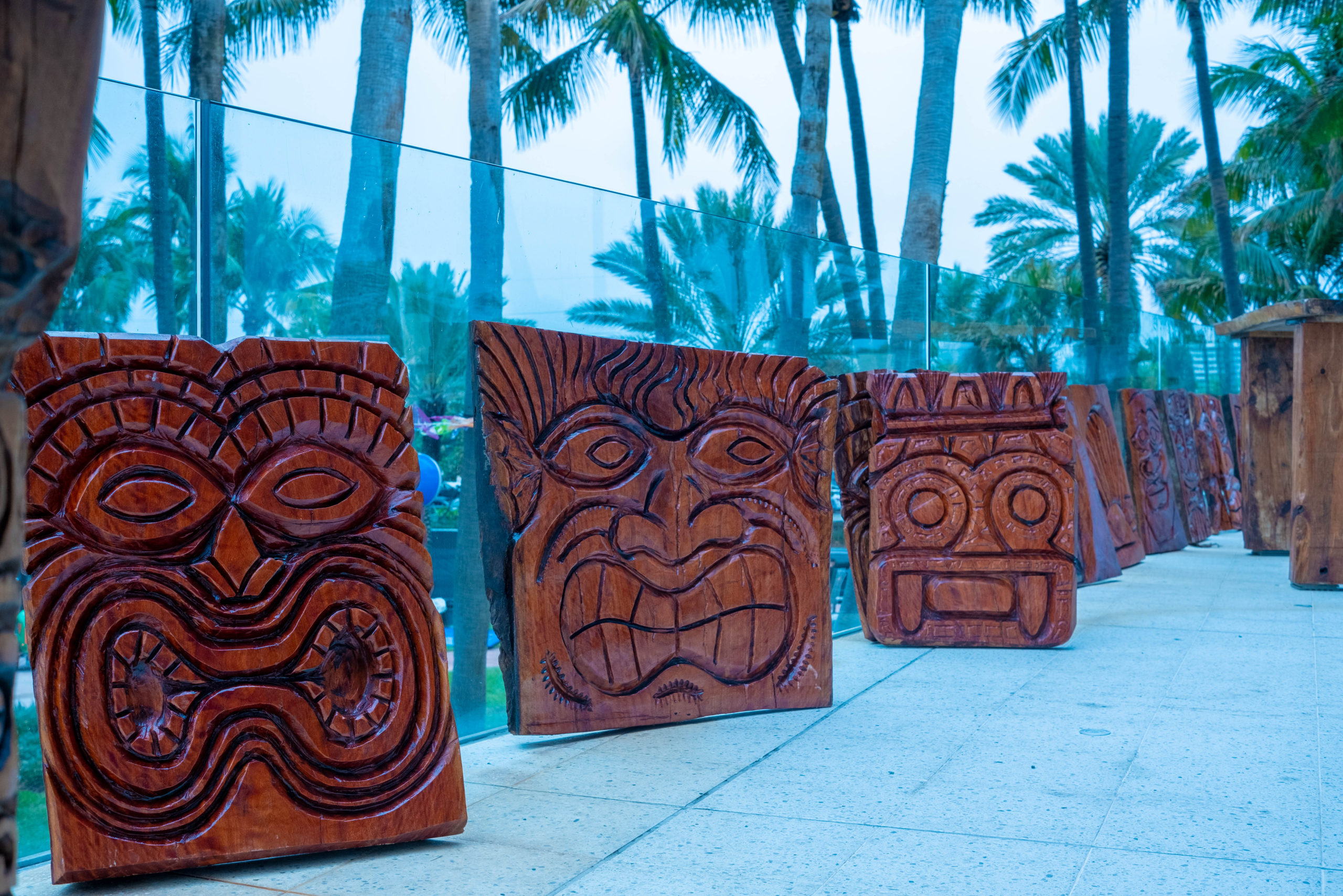 Six floral Tables glass tops 40, Pinapple glasses, as many exotic wood tables as needed, 2 sail boards painted with oceanic Art, up to 40 Tiki’s varying heights 3 feet in to 4 feet also 6 to 10 very large Tiki‘s, multiple Tiki Bars utilizing Tikis‘s as bases and exotic wood tops with bamboo facials, and pre-built Tiki huts which provide shade coverage different sizes available, as well as Thatch they could be mounted on existing structures for The Polynesian look, string lighting and battery lighting for areas without electricity and Tiki torches.