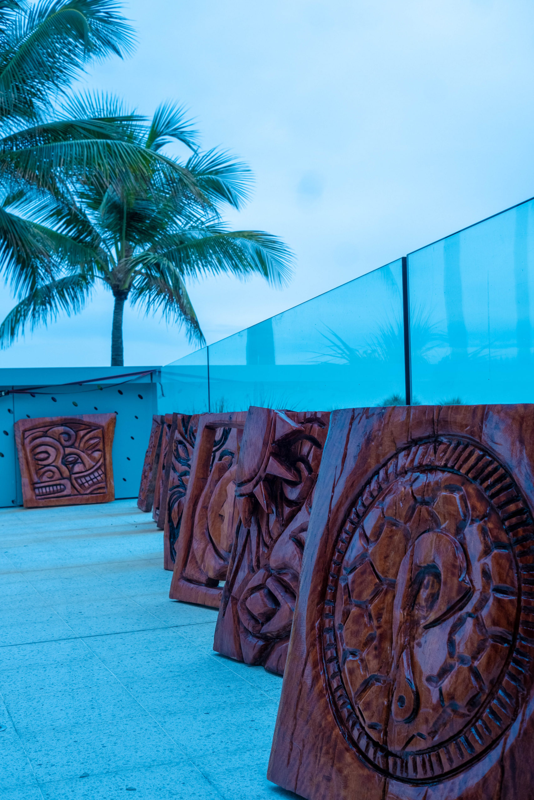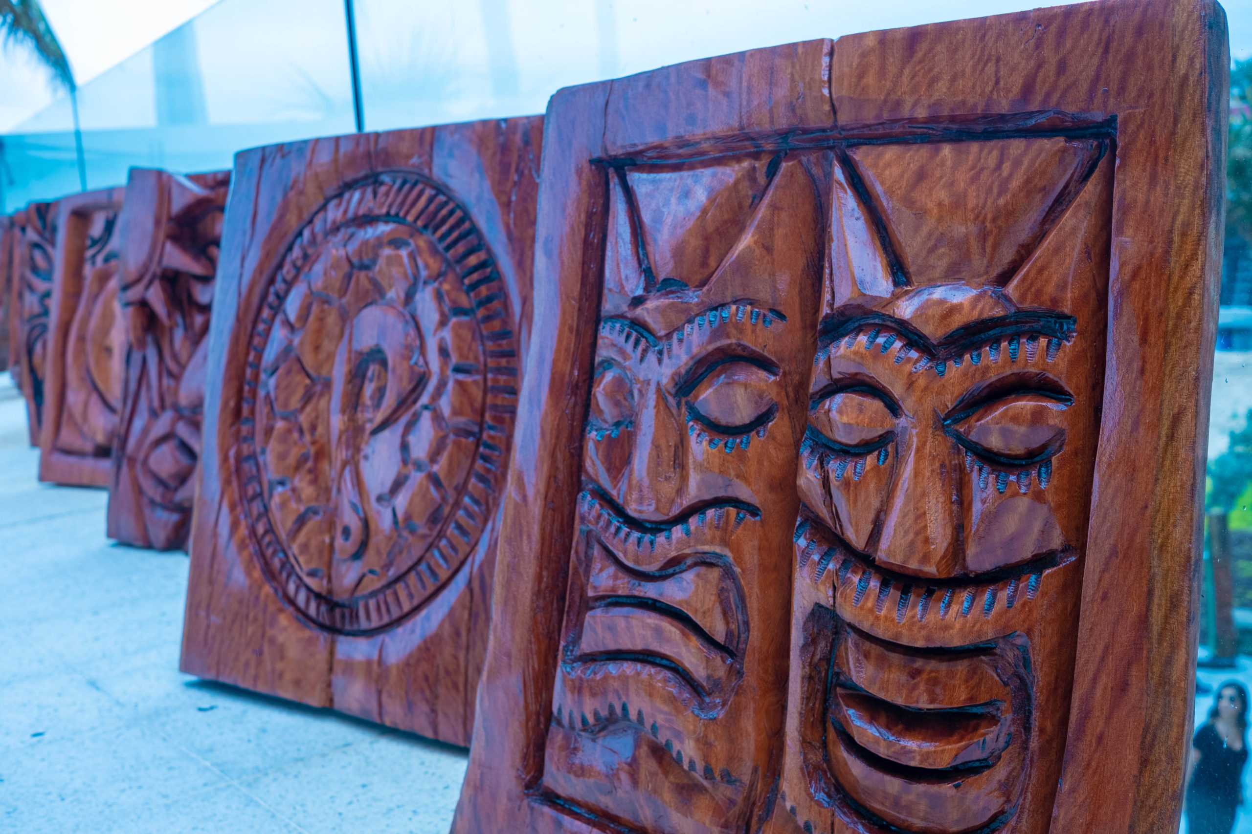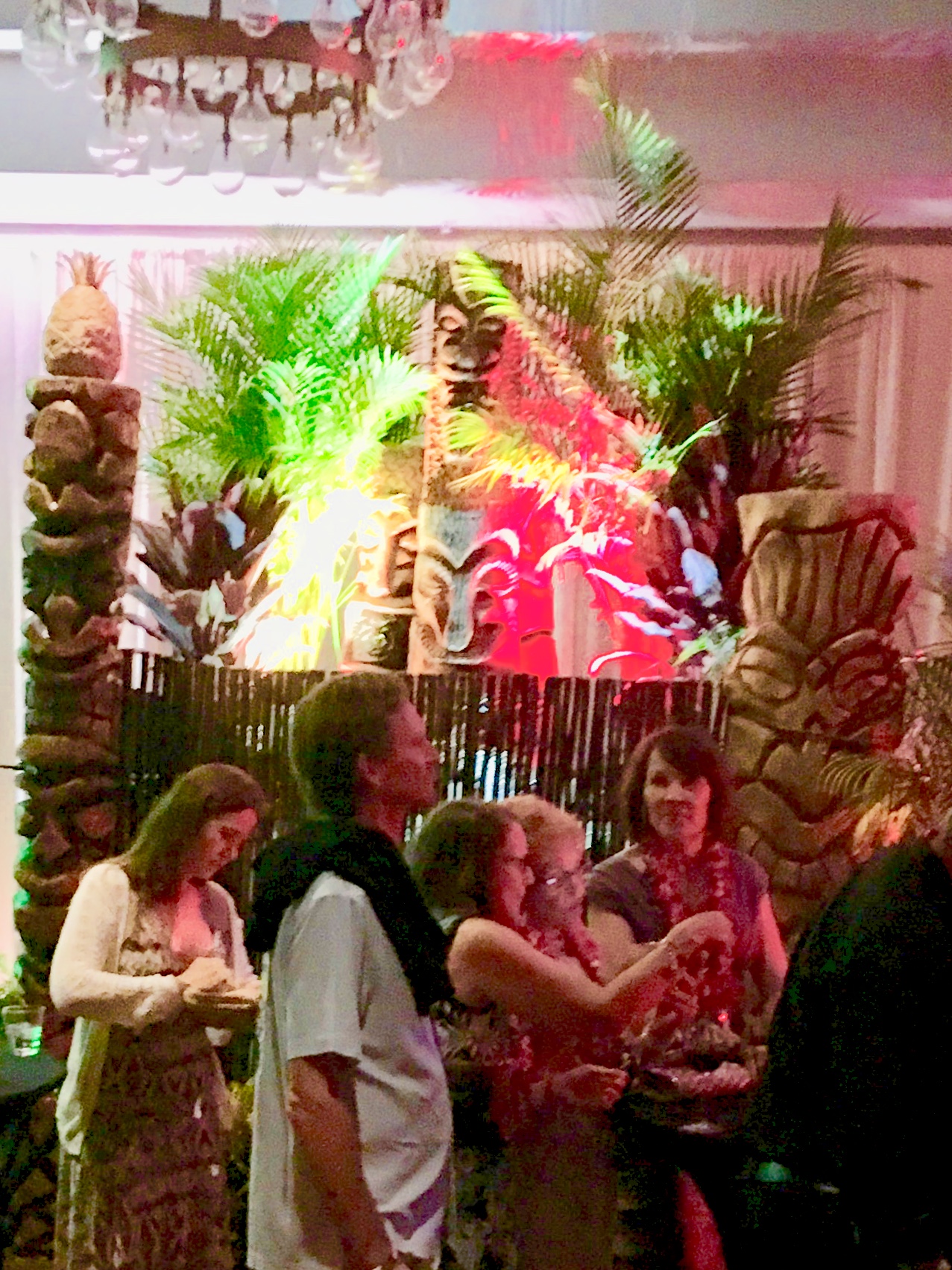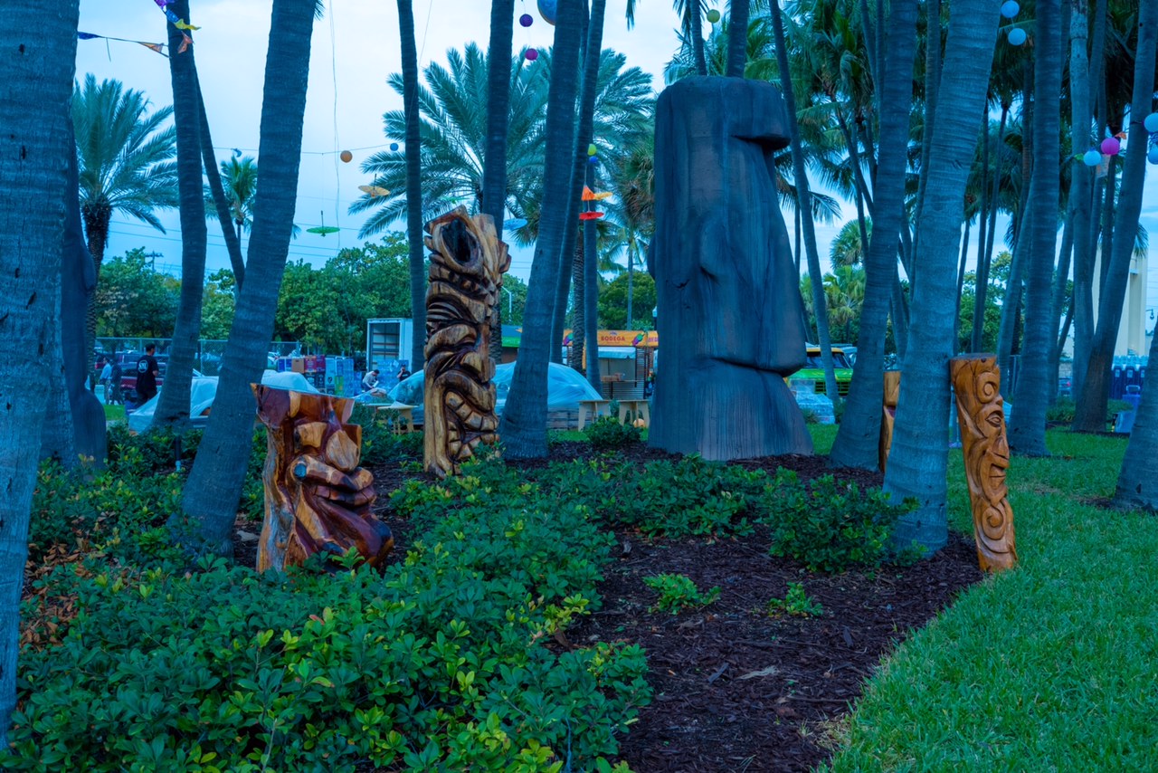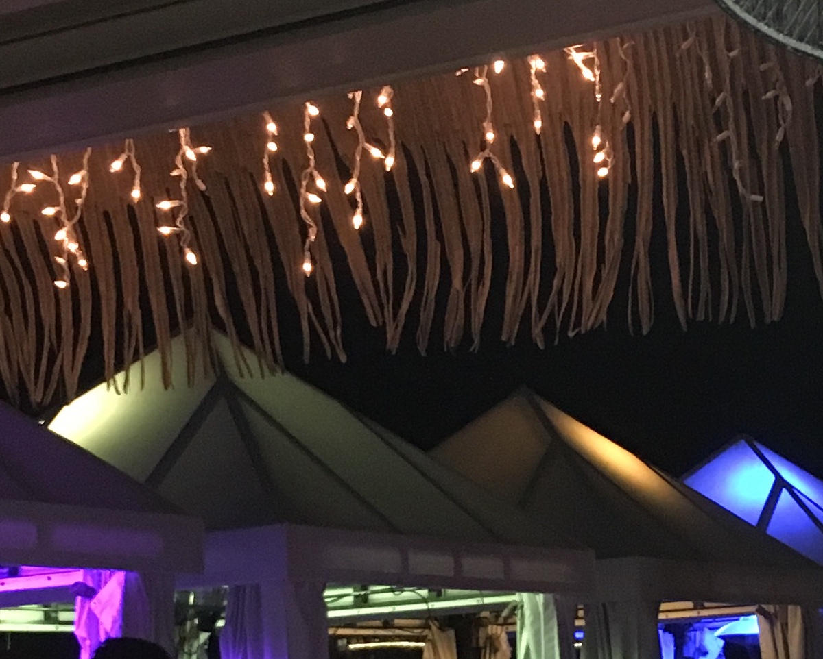 Six floral Tables glass tops 40, Pinapple glasses, as many exotic wood tables as needed, 2 sail boards painted with oceanic Art, up to 40 Tiki’s varying heights 3 feet in to 4 feet also 6 to 10 very large Tiki‘s, multiple Tiki Bars utilizing Tikis‘s as bases and exotic wood tops with bamboo facials, and pre-built Tiki huts which provide shade coverage different sizes available, as well as Thatch they could be mounted on existing structures for The Polynesian look, string lighting and battery lighting for areas without electricity and Tiki torches.