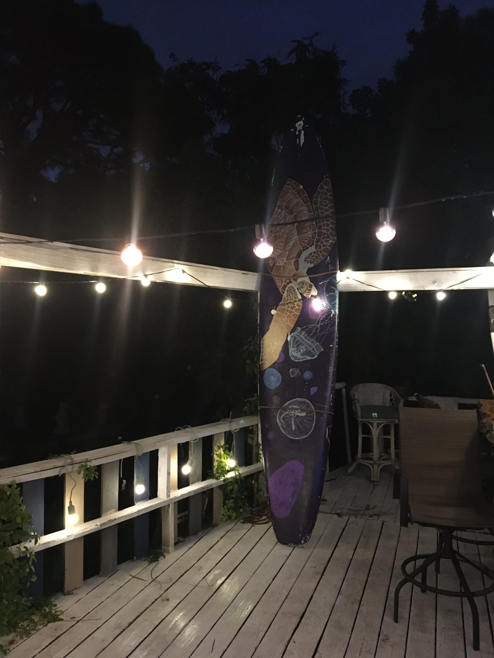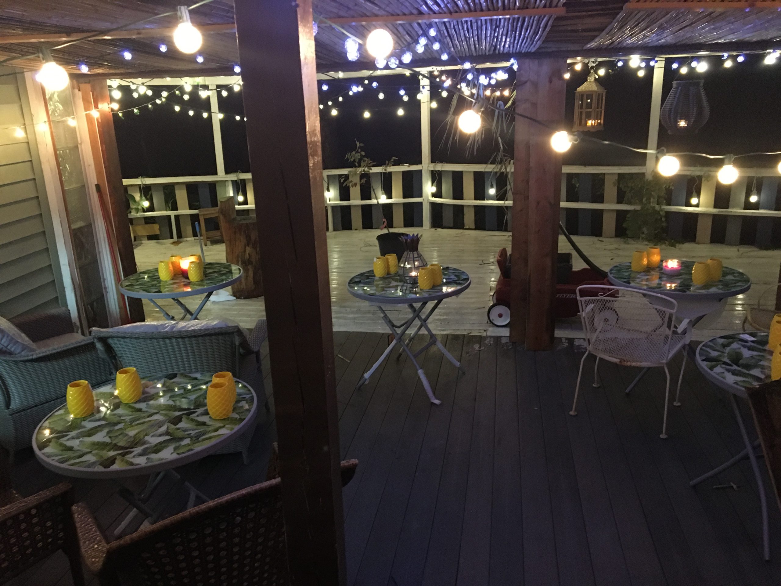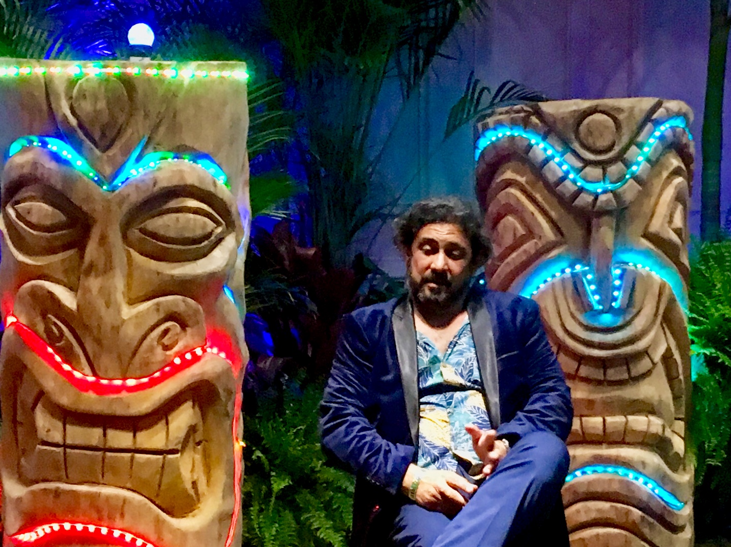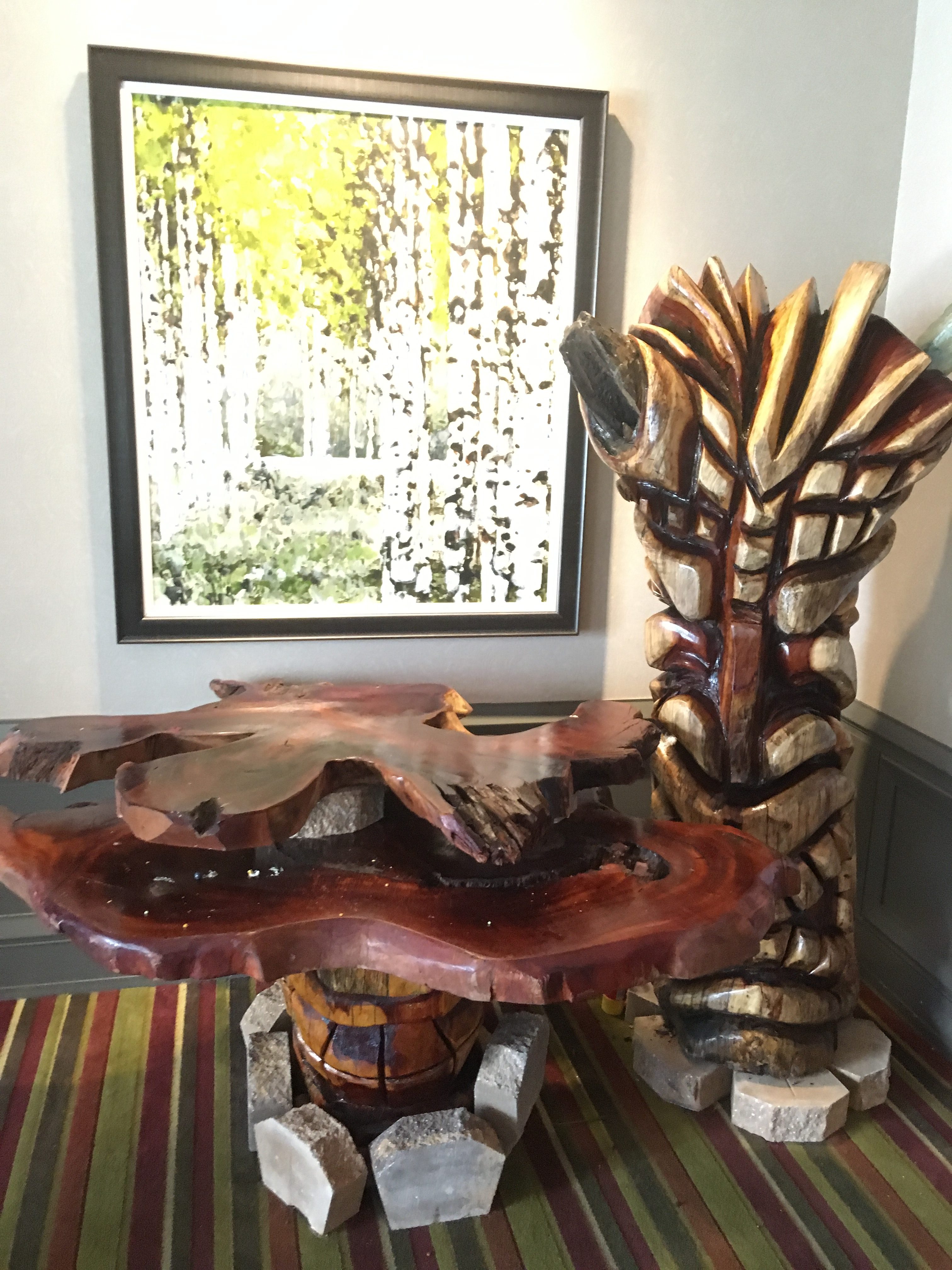 Six floral Tables glass tops 40, Pinapple glasses, as many exotic wood tables as needed, 2 sail boards painted with oceanic Art, up to 40 Tiki’s varying heights 3 feet in to 4 feet also 6 to 10 very large Tiki‘s, multiple Tiki Bars utilizing Tikis‘s as bases and exotic wood tops with bamboo facials, and pre-built Tiki huts which provide shade coverage different sizes available, as well as Thatch they could be mounted on existing structures for The Polynesian look, string lighting and battery lighting for areas without electricity and Tiki torches.